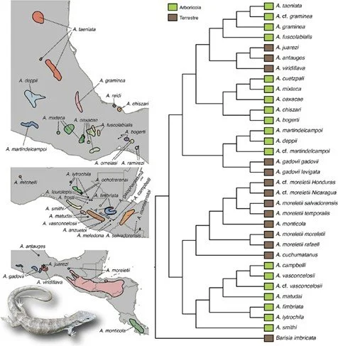 The genus Abronia contains both terrestrial and arboreal species, each showing unique adaptations. This project funded by SECIHTI will use morphometric and whole-genome-sequencing data to test for convergence associated with habitat use in the genus. Using an updated phylogenetic hypothesis, we will test whether the phenotype and genotype show convergent signatures of adaptation to terrestrial and arboreal habits, respectively (photo in the figure by Josiah Townsend, CC BY-SA 4.0).